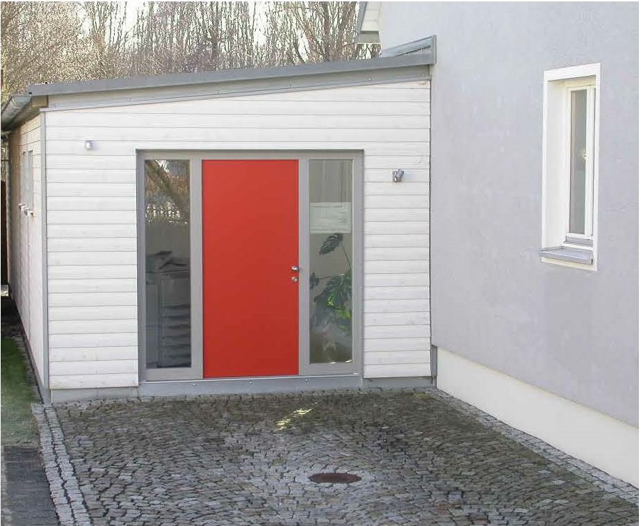 Büroanbau an ein Wohnhaus, Ausführung als Grenzbebauung mit großzügiger Verglasung zum Garten. Offener Grundriss, der verschiedene Nutzungen zulässt. Schlichte Baukörperform mit Pultdach. Ausführung in Holzbauweise nach energetischen nund baubiologischen Gesichtspunkten.BV: | Büroanbau in Holzständerkonstruktion |